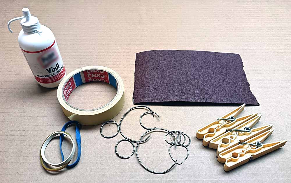 Sono necessari: colla vinilica, nastro adesivo di carta, mollette da bucato, elastici, carta vetrata grossa e fina, mollette di acciaio armonico.